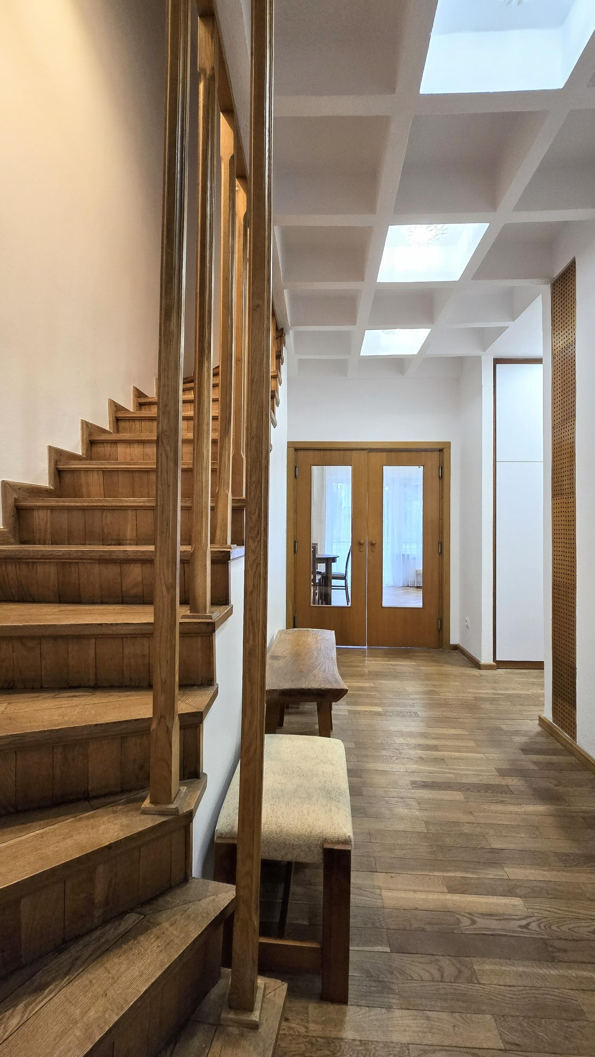 Na podłodze w hallu, schodach i pokojach znajduje się piękna, drewniana, olejowana podłoga,