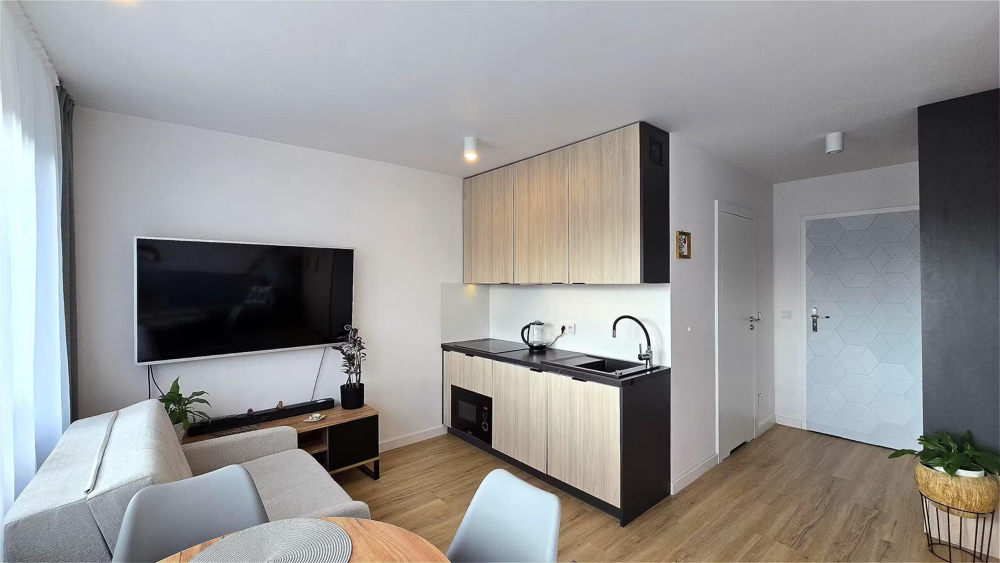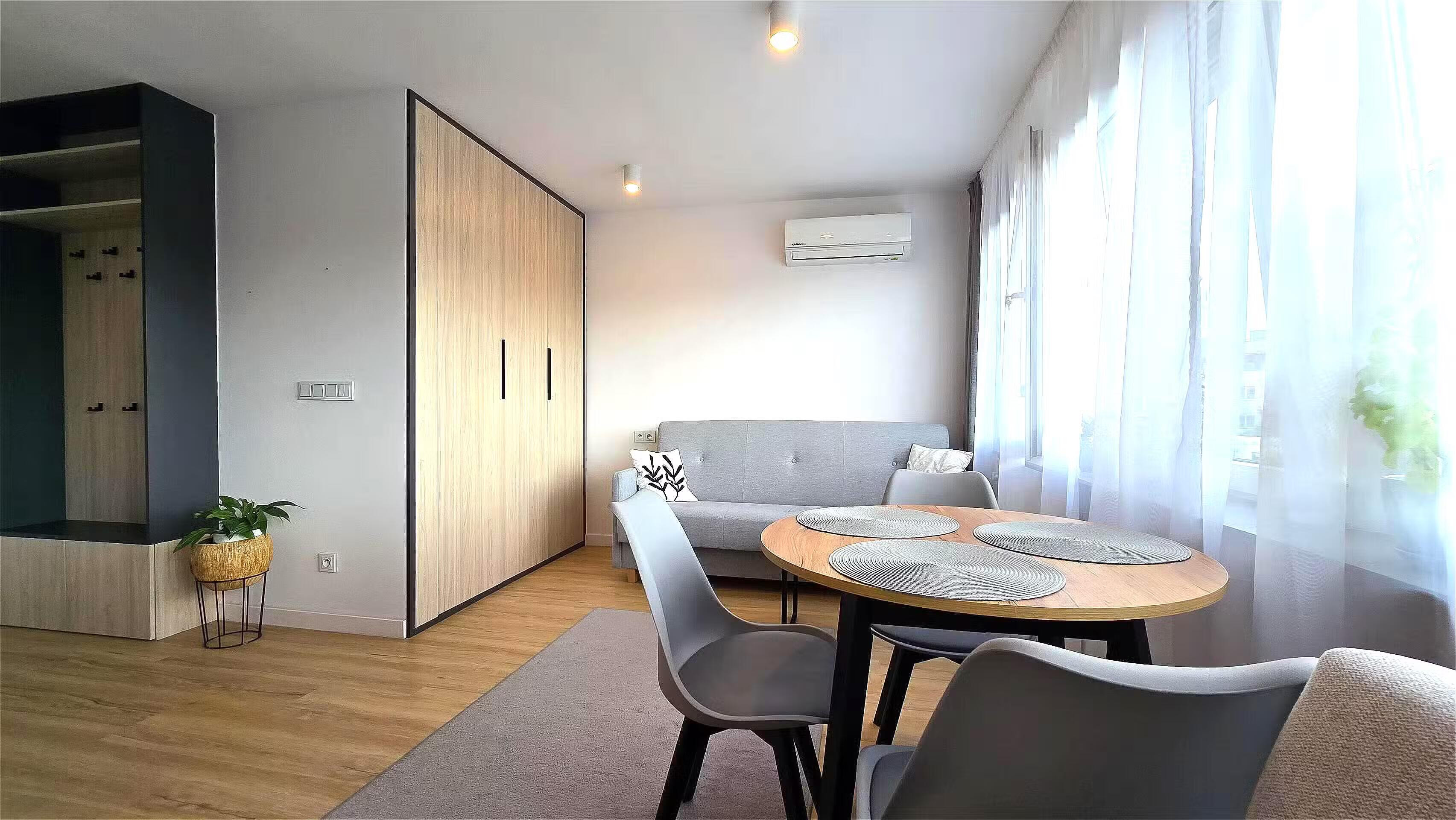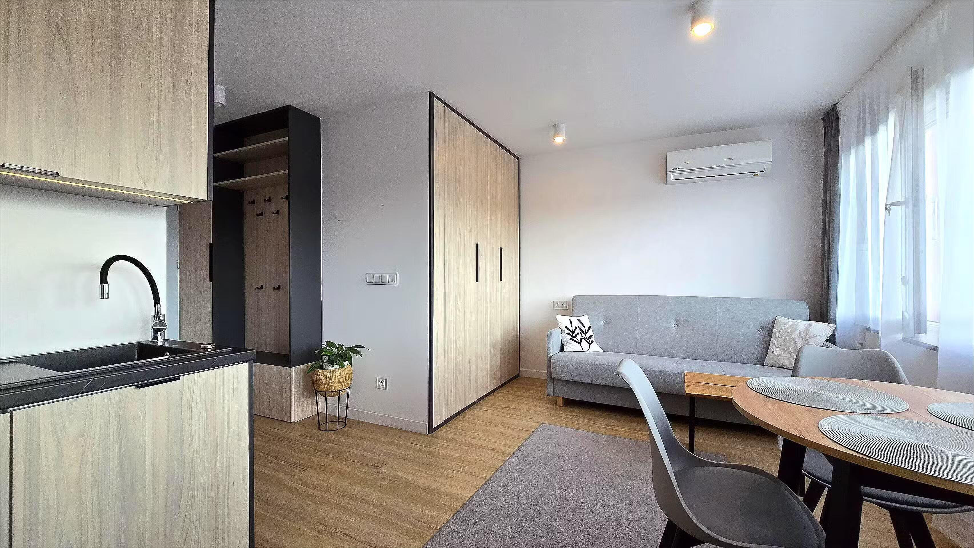 Kawalerka przeszła generalny remont i została wyposażona w przemyślany system przechowywania. W holu znajduje się duża, bardzo pojemna szafa w stałej zabudowie, a w łazience szafka w zabudowie, szafka pod umywalką oraz pralka. W aneksie kuchennym w meble w stałej zabudowie z wbudowaną mikrofalówką, płytą indukcyjną i lodówką. Jest wyciąg. Mieszkanie może zostać wynajęte z meblami lub bez. Okna od zachodu. Jest klimatyzacja.
