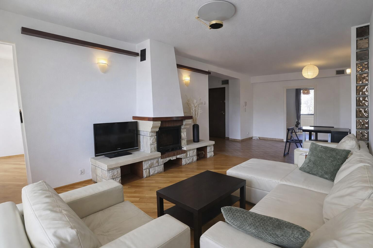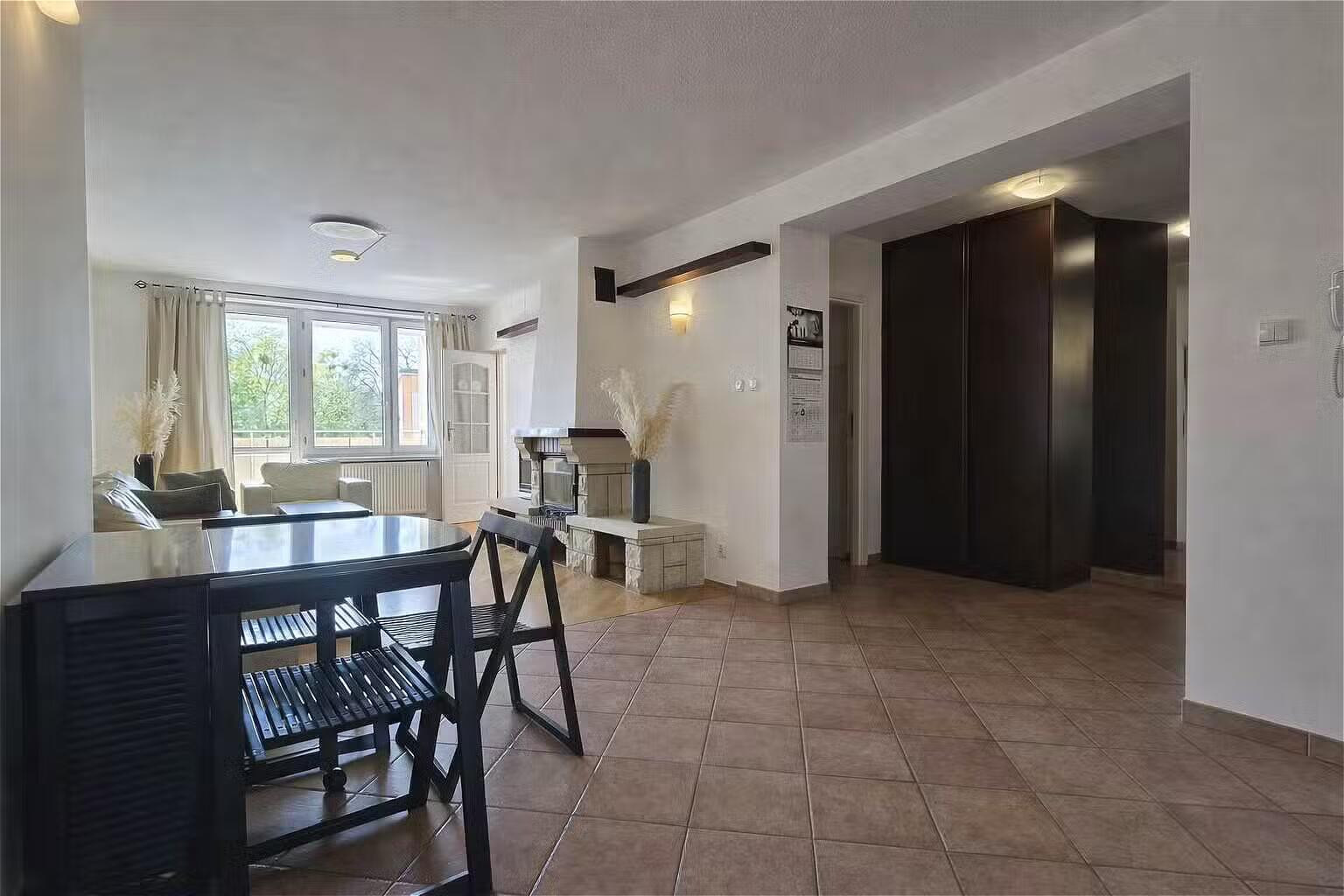- salon z kominkiem i wyjściem na balkon