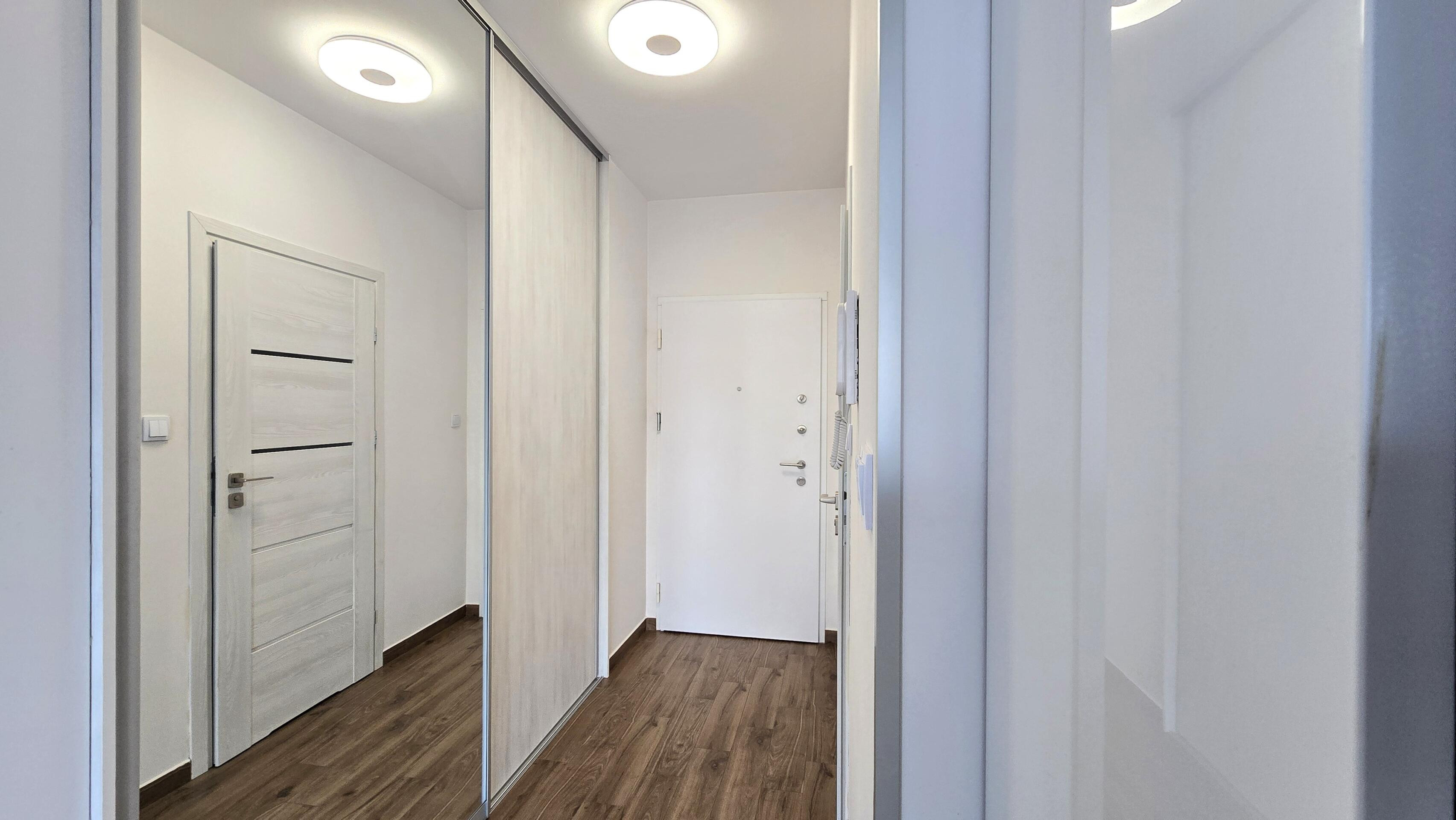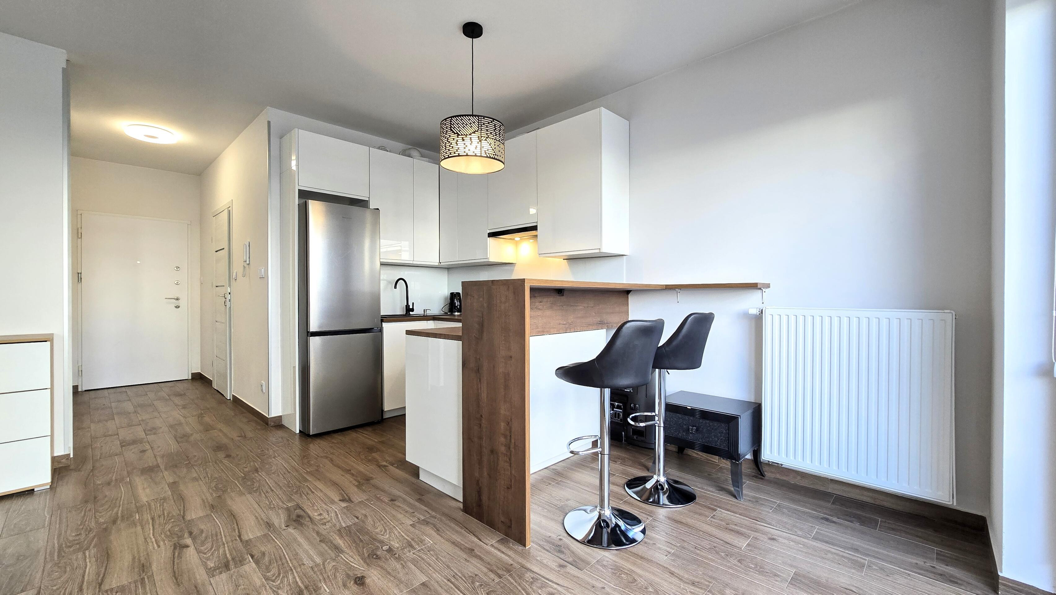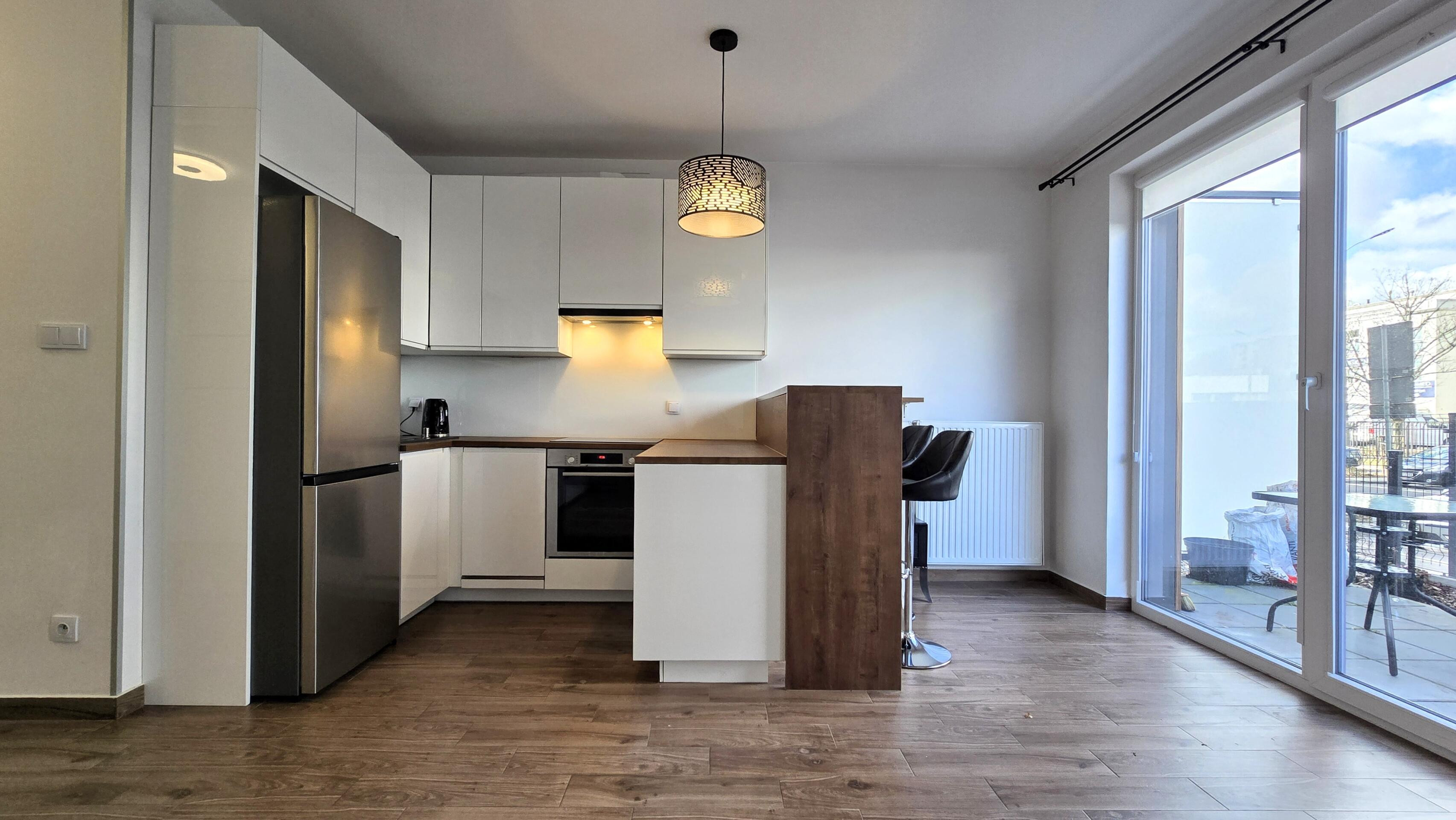 Kuchnia wyposażona w nowe sprzęty: płytę indukcyjną, piekarnik elektryczny, zmywarkę lodówko-zamrażarkę, okap. W łazience pralko-szuszarka. W przedpokoju szafa w zabudowie.